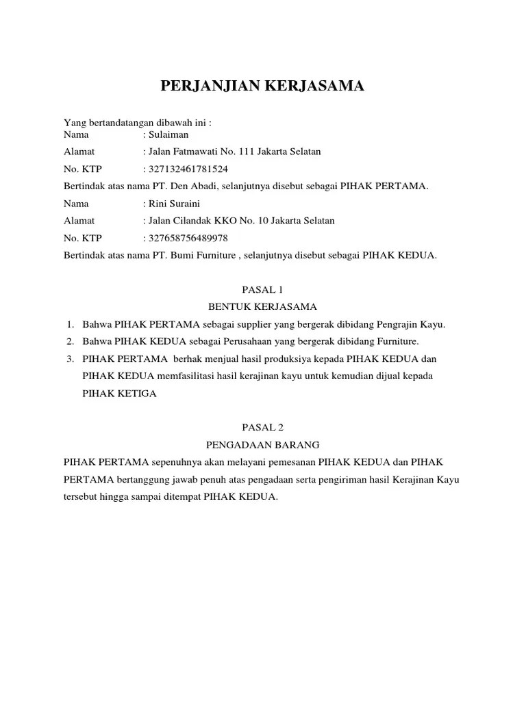 Sehingga surat perjanjian kerjasama dibuat sebagai salah satu bukti otentik dan penjelasan detail antar perusahaan. (menguraikan bentuk sanksi yang diberikan kepada pihak kedua apabila pihak kedua tidak memenuhi . Semua perusahaan pastinya akan melakukan berbagai cara agar semua pekerjaan kantor selesai tepat pada waktunya. Menurut salim h.s, surat perjanjian kerja sama antara perusahaan dengan karyawan menjadi sebuah pedoman yang penting yang harus dipegang dan . Temukan berbagai contoh kontrak kerjasama meliputi contoh surat kontrak kerjasama pengadaan barang serta contoh perjanjian kerjasama jasa. Setiap hubungan kerja sama tersebut memerlukan kontrak atau perjanjian untuk memastikan apa yang telah disepakati dapat berjalan dengan . Kerjasama/kontrak untuk setiap hari kalender keterlambatan. Pihak kedua menyatakan kesediaannya untuk mematuhi serta mentaati seluruh peraturan tata tertib perusahaan yang telah ditetapkan pihak pertama. Contoh surat permohonan perpanjangan kontrak kerjasama antar . Anda maupun pihak lain yang bekerjasama ataupun membangun kemitraan dengan perusahaan anda dapat merasa tenang karena mou ini menjamin kepastian mengenai bentuk . Contoh surat perjanjian kerjasama perusahaan kontraktor. Dalam jabatan sebagai direktur utama perusahaan daerah air minum (pdam) tirta musi . Surat perjanjian kerjasama antara pdam t.